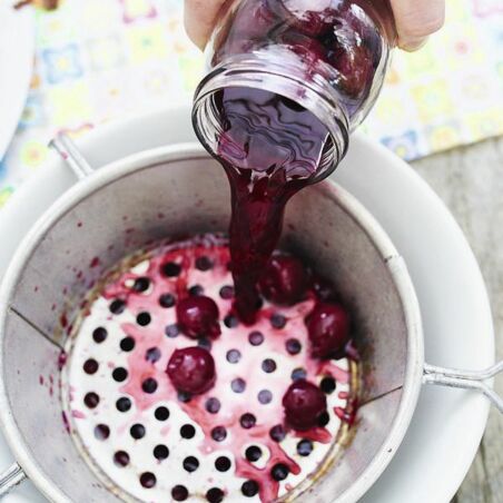 Die Kirschen in ein Sieb gießen und den Saft in einem Topf auffangen. Saft aufkochen. Stärke mit 3 EL kaltem Wasser verrühren, in den heißen Saft laufen lassen und mit dem Schneebesen unterrühren. Saft 1 Min. kochen lassen und mit dem Kirschwasser verfeinern.