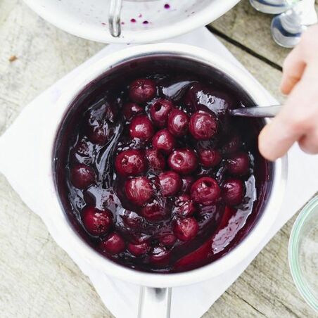 Topf vom Herd ziehen und stehen lassen, bis der Saft merklich eingedickt ist. Dann Kirschen dazugeben und vorsichtig untermengen. In einer Schüssel Puderzucker, Milch und Mascarpone mit dem Schneebesen oder Handrührgerät zu einer glatten Creme verrühren.