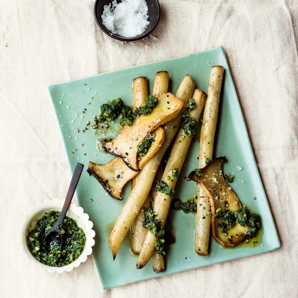 Unser neues Dreamteam: Schwarzwurzeln mit Kräuterseitlingen. Fehlt nur noch ein aromatisches Nuss-Pesto, fertig ist der köstliche Gemüsegenuss.