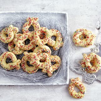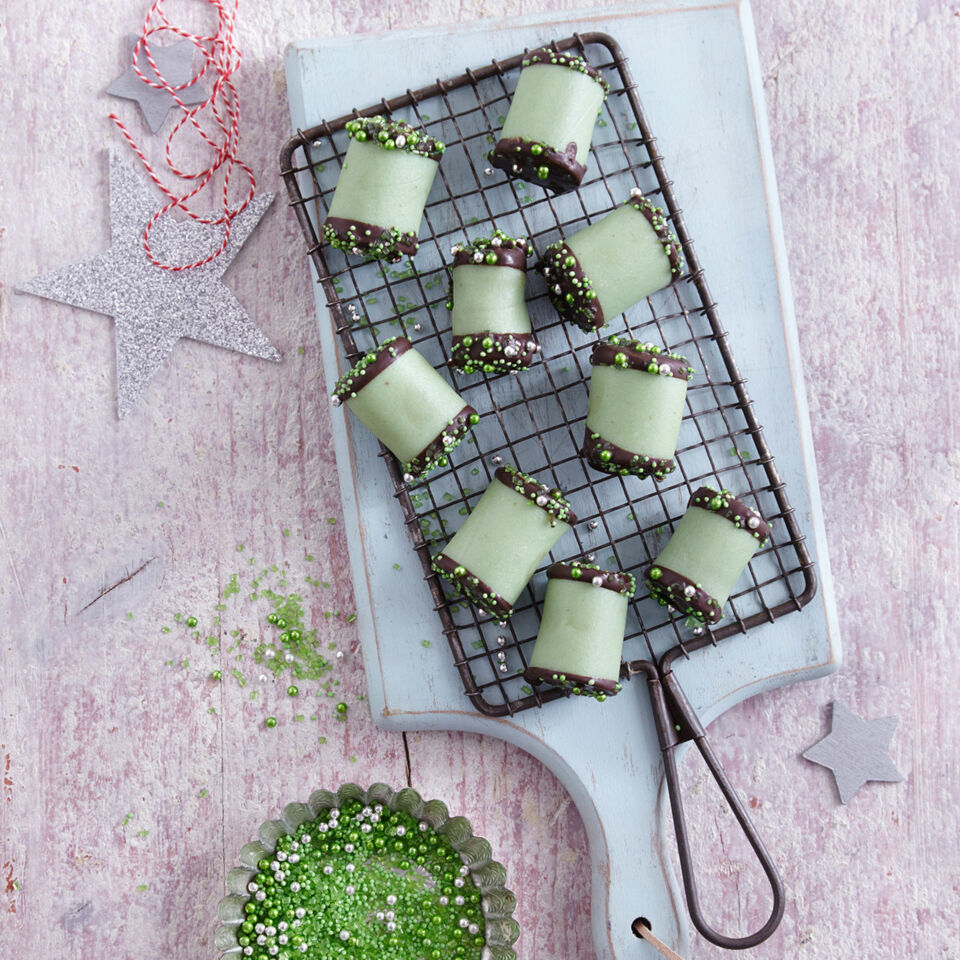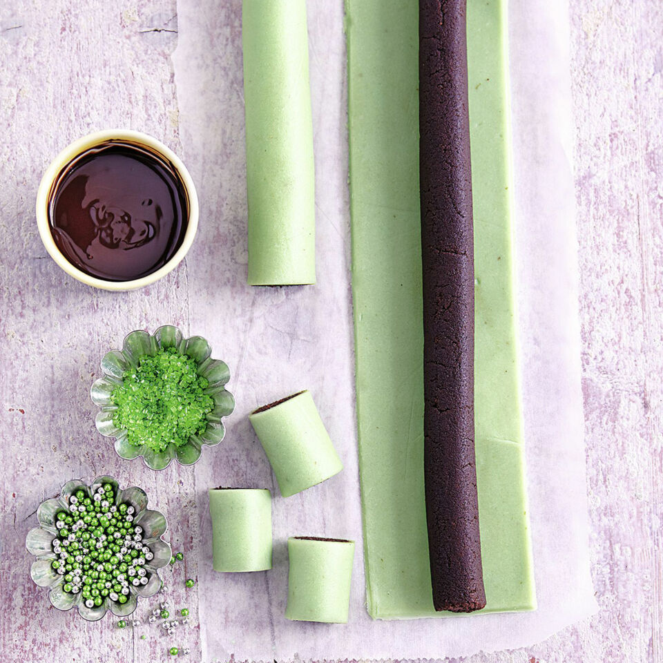 Den Kuchenteig zu zwei Rollen à 36 cm Länge formen. Jeweils auf ein Marzipanrechteck legen und dieses mithilfe des Backpapiers aufrollen, an der Kante leicht festdrücken. Die Rollen in ca. 4 cm breite Stücke schneiden. Kuchenglasur nach Packungsanweisung schmelzen. Die Punschrollen mit den Enden ca. 5 mm tief eintauchen. Kurz abtropfen lassen, mit Zuckerperlen bestreuen und auf Backpapier trocknen lassen.