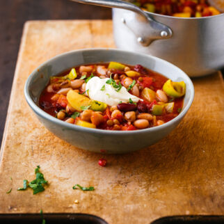 Blumenkohl, Brokkoli, Möhren, Erbsen und Kartoffeln dazugeben, aufkochen und zugedeckt bei schwacher Hitze 20 Min. köcheln lassen.