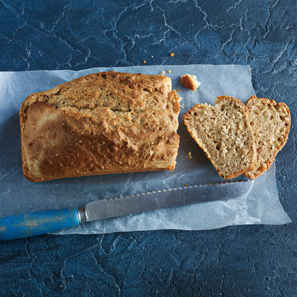 Den Backofen auf 200° vorheizen (Umluft nicht geeignet). Die Backform einfetten, den Teig einfüllen, glatt streichen, Oberfläche mit einem Messer längs einmal einschneiden und das Brot auf der zweiten Schiene von unten ca. 45 Min. backen. Das Brot auf ein Kuchengitter stürzen und auskühlen lassen. Dieses Brot schmeckt am besten am Backtag.
