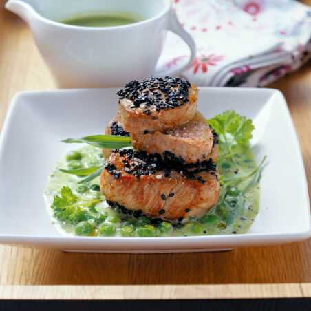 Die Erbsensauce mit dem Schweinefilet auf vorgewärmten Tellern anrichten und mit den Kräutern garnieren. Als Beilage eignen sich in Olivenöl gebratene neue Kartoffeln.