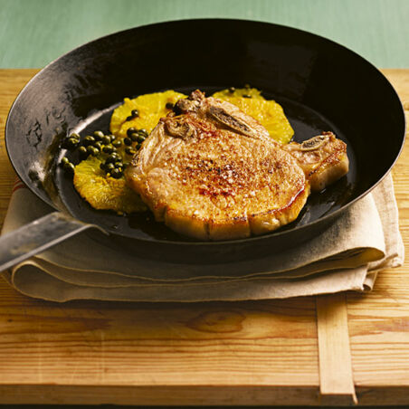 Fleisch salzen. Orangenscheiben mit Schale und Kapern in die Pfanne geben und 2 Min. mitbraten.