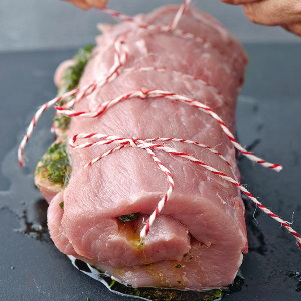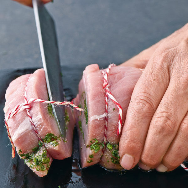 Kurz vor dem Essen das Fleisch aus dem Kühlschrank nehmen und zwischen den Garnschlingen in ca. 3 cm dicke Scheiben schneiden.