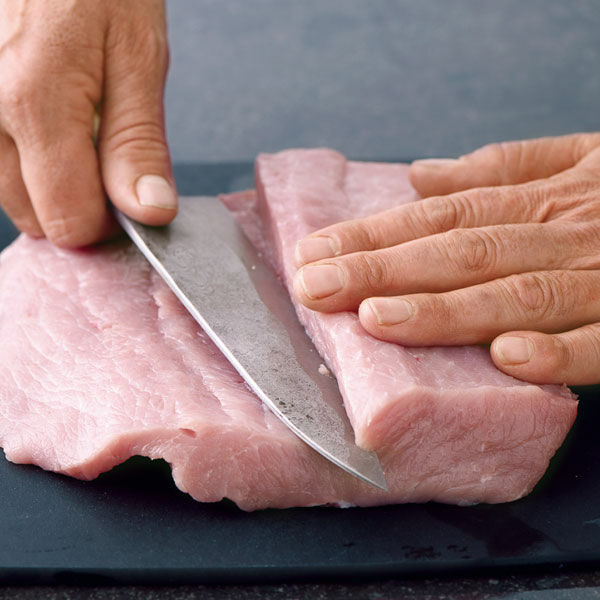 Das Fleisch gründlich trocken tupfen und falls nötig von Sehnen befreien. Mit einem langen, scharfen Messer an der langen Seite einschneiden, als solle eine 1-2 cm dicke Scheibe abgeschnitten werden. Der Rundung des Fleischs folgend immer weiter schneiden, bis ein großes, flaches Stück entstanden ist. Das Fleisch innen mit Pfeffer würzen, wieder zusammenrollen und abgedeckt in den Kühlschrank legen.