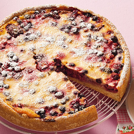 Beeren auf dem Teig verteilen, mit Mehl bestäuben. Eiermasse darübergießen. Im Ofen (2. Schiene von unten) 40– 45 Min. backen. Warm oder kalt mit Puderzucker bestäubt reichen.
