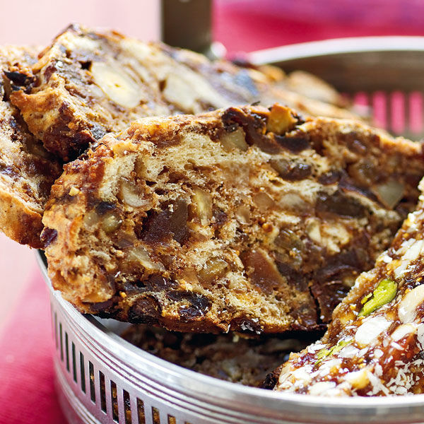 Das Backblech mit Backpapier auslegen. Die Fruchtmischung unter den Hefeteig kneten, den Teig zu vier länglichen Broten formen. Die Brote aufs Blech legen und zugedeckt ca. 30 Min. gehen lassen. Den Backofen auf 180° (Umluft 160°) vorheizen.