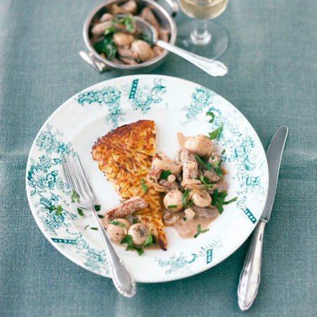 Im Ofen bis zum Servieren warm stellen. Die Rösti kann gut als Beilage zu Geschnetzeltem oder Möhren-Curry serviert werden.