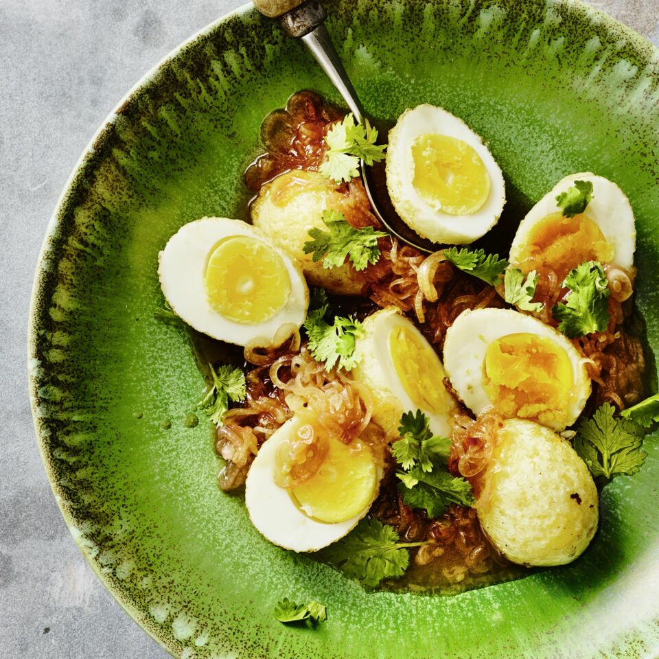 Zum Servieren die frittierten Eier halbieren und auf einer Platte anrichten. Die vorbereitete Sauce darübergießen und die Eier mit den Korianderblättern garnieren.
