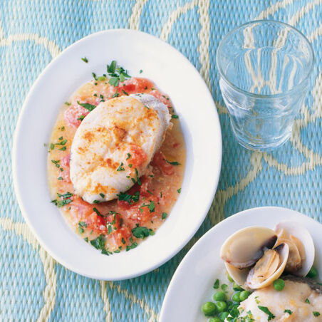Den Fisch samt dem Saft, der sich gebildet hat, wieder einlegen. Zugedeckt bei schwacher Hitze 5-6 Min. leise kochen lassen, dabei die Pfanne gelegentlich rütteln. Die Petersilie waschen und trockenschütteln, die Blätter fein hacken und vor dem Servieren darüber streuen.