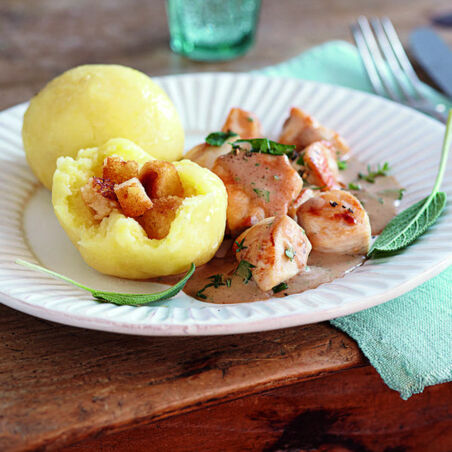 Die »Seidenen« Klöße werden aus gekochten Kartoffeln zubereitet und gelingen besonders leicht. In ihnen verstecken sich geröstete Brotwürfel.