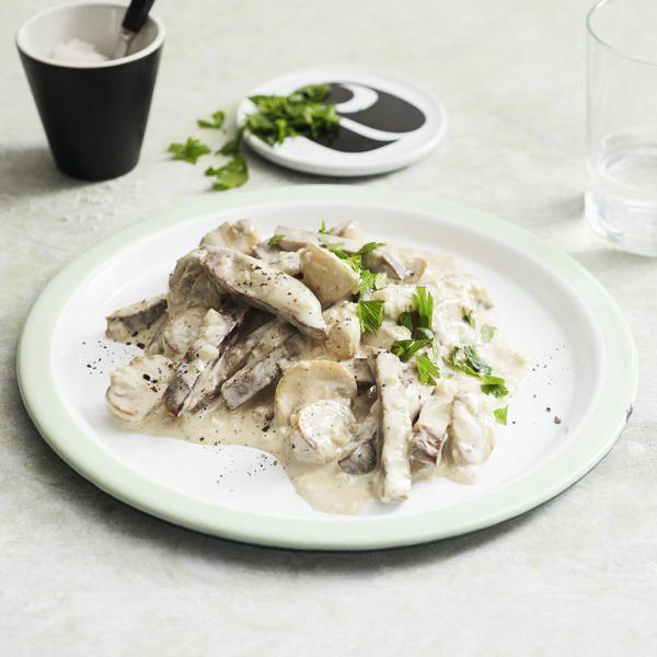 Wenn die Sauce schön cremig ist, die Champignons und die Seitanstreifen wieder zurück in die Pfanne geben und in der Sauce unter Rühren erhitzen. Die Seitan-Pilz-Mischung mit Salz und Pfeffer abschmecken. Die Petersilie waschen und trocken schütteln. Die Blättchen abzupfen, fein hacken und über das Seitan-Geschnetzelte streuen. Dazu schmecken Rösti oder Bandnudeln.