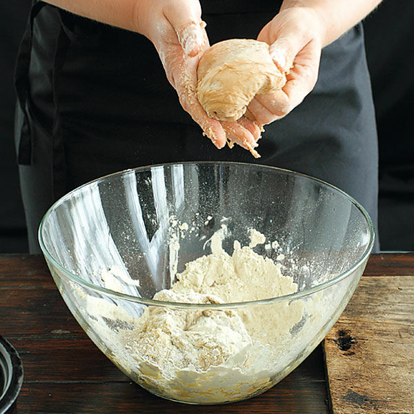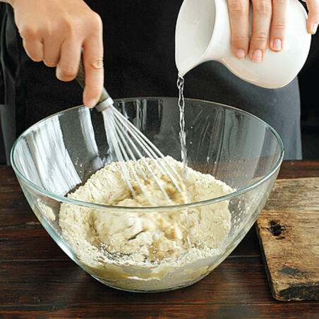 Das Glutenpulver in einer Schüssel mit 300 ml Wasser vermengen und mit einem Schneebesen zu einem homogenen Teig verarbeiten. Den Teig dritteln, zu Klößen formen und kurz beiseitestellen.