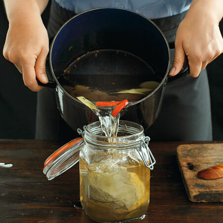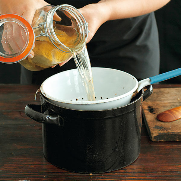 Das Glas nach Ablauf der Garzeit vorsichtig herausnehmen (Achtung, heiß!) und die Brühe durch ein Sieb abgießen. Die Flüssigkeit aus dem Glas auffangen, sie kann für die nächste Portion Seitan noch einmal verwendet werden.