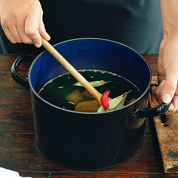 Die Zwiebel schälen und halbieren. Die Knoblauchzehen schälen. Die Chilischote waschen. In einem großen Topf 2,5 l Wasser aufkochen. Zwiebelhälften, Knoblauch, die ganze Chilischote und die übrigen Zutaten hinzugeben und die Brühe kräftig mit Salz abschmecken. Sie sollte leicht überwürzt sein, damit der Seitan möglichst viel Geschmack annimmt.