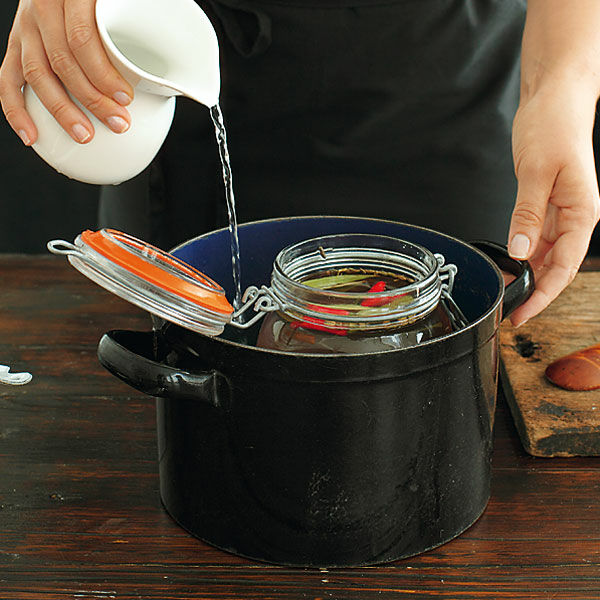 Die Seitanklöße in das Glas geben und mit der kochenden Brühe übergießen. Das Glas locker verschließen (den Deckel nicht ganz aufschrauben) und zurück in den Topf stellen. So viel Wasser angießen, dass das Glas zu drei Vierteln im Wasser steht, und zum Kochen bringen. Danach auf mittlere Hitze reduzieren und 50 Min. köcheln lassen.
