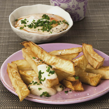 Fernsehsnack vegetarisch: Die gedünsteten Gemüsesticks werden frittiert und in exotisch gewürzte Joghurt-Schmand-Sauce gedippt.
