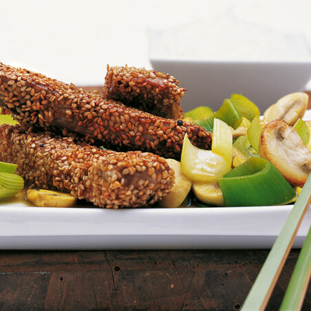 Edel und simpel aus der Asia-Küche: Nach dem Bad in Sojasauce, schlüpft er in einen Sesammantel und hüpft in die Pfanne, um sich rundum schön bräunen zu lassen. Hhmmm...