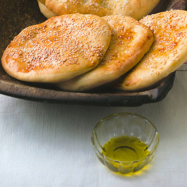 Das Ei mit 2 EL Wasser verrühren. Die Teigfladen damit bestreichen und mit Sesam bestreuen. Mit einem Tuch bedecken und noch 10 Min. ruhen lassen. Die Sesamfladen im Ofen (Mitte, Umluft 180°) 20-25 Min. goldbraun backen.