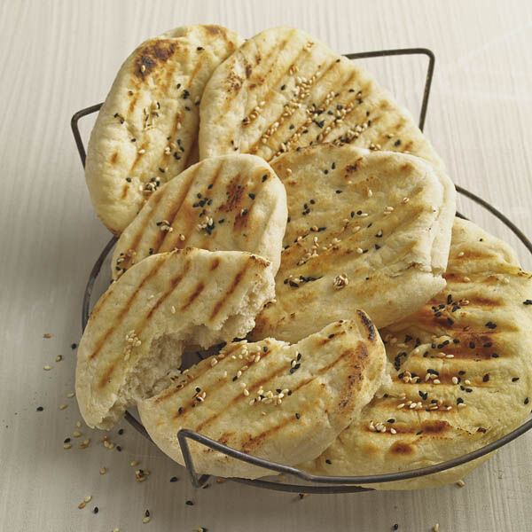 Aufgegangenen Teig in vier Portionen teilen. Jede Portion auf einer mit Mehl bestreuten Arbeitsfläche zu einer Kugel formen, diese zu einem fingerdicken Fladen ausziehen. Der Fladen muss nicht exakt rund sein. Fladen rundherum mit Öl bepinseln und beträufeln. Die Oberfläche mit Sesam und Schwarzkümmel bestreuen. Körnchen mit der Handfläche leicht aufdrücken.