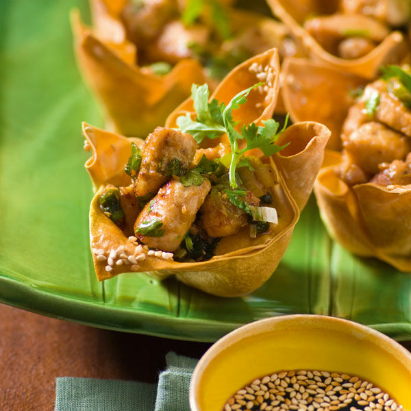 Asiatisch-leicht und wunderschön anzusehen sind diese Teigschälchen mit der würzigen Hühnerfüllung, der ideale Snack für ein Fingerfood-Büffet.