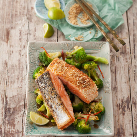 Scharfer Wasabi und eine nussige Kruste peppen den zarten Lachs auf. Und der Brokkoli hat sich mit Ingwer, Chili und Limette extra frisch gemacht.