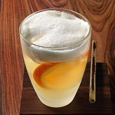 Für das weiße Häubchen ist ein ganz frisches Eiweiß verantwortlich, das im Shaker zusammen mit Gin und Eis geschüttelt wird.