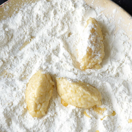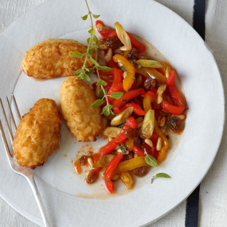 Die restlichen 2 Eier in einem tiefen Teller verquirlen. Das Mehl auf einen Teller geben. Aus der Risottomasse mit einem angefeuchteten Esslöffel Nocken abstechen. Die Baduzzi zuerst in den Eiern, dann im Mehl wenden. Das restliche Olivenöl in einer Pfanne erhitzen und die Baduzzi darin goldbraun ausbacken. Mit der Peperonata servieren.