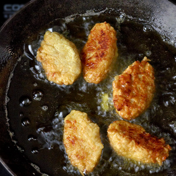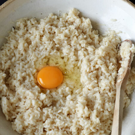 Den Risotto vollständig abkühlen lassen, dann 1 Ei gründlich untermischen und mit Salz und Pfeffer würzen. Die Rosinen mit 1 EL Essig und 3 EL Wasser in einen Topf geben und aufkochen lassen, den Herd abschalten und die Rosinen ziehen lassen.