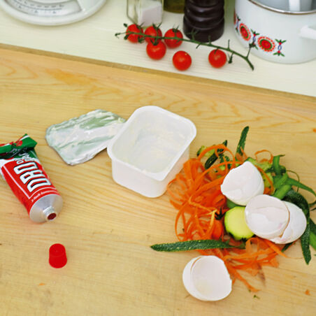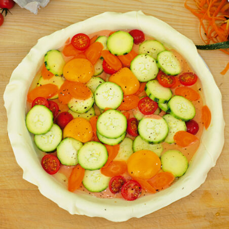 Den Zucchino waschen und in dünne Scheiben schneiden. Die Möhren waschen, schälen und ebenfalls in dünne Scheiben schneiden. Die Tomaten waschen und die Früchte halbieren. Das Gemüse unter die Quarkcreme heben. Mit Salz und Pfeffer abschmecken und die Hälfte der Masse in die Form füllen.