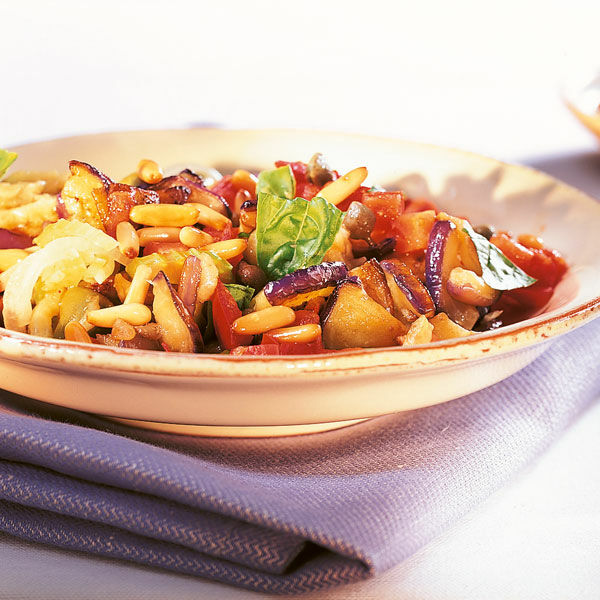 Eine kleine Pfanne heiß machen, Pinienkerne darin unter Rühren so lang rösten, bis sie goldgelb sind. Die Caponata kalt werden lassen. Pinienkerne drauf streuen.