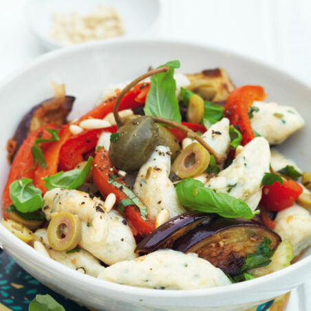 Inzwischen Kapern fein hacken und Oliven in Scheiben schneiden. Kräuter abbrausen und trocken schütteln, die Blättchen abzupfen und grob hacken. Auberginen, Kapern, Oliven und Pinienkerne zum Gemüse geben, mit Essig und ca. ½ TL Zucker würzen. Zugedeckt ca. weitere 15 Min. garen, dabei ab und zu umrühren. Eventuell mit Salz, Pfeffer, Essig und Zucker abschmecken. Kurz abkühlen lassen und die Kräuter unterrühren. Das Gemüse schmeckt zu den Basilikumgnocchi oder zu frischem Weißbrot.