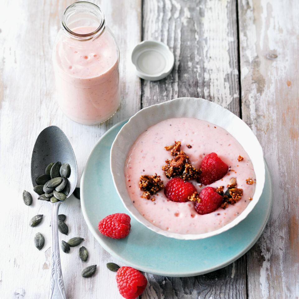 Den Smoothie auf zwei kleine Schüsseln verteilen, dann mit den restlichen Himbeeren, 1 EL Kürbiskernen und dem Granola bestreuen. Sofort servieren.
