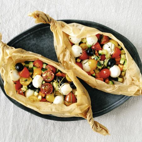 Ob auf dem Grill oder aus dem Ofen: Gemüsepäckchen sind easy gemacht und prall gefüllt mit dem Besten, was die Saison zu bieten hat. Hier ein Rezept für den Sommer: Gemüsepäckchen mit Zucchini und Tomaten.