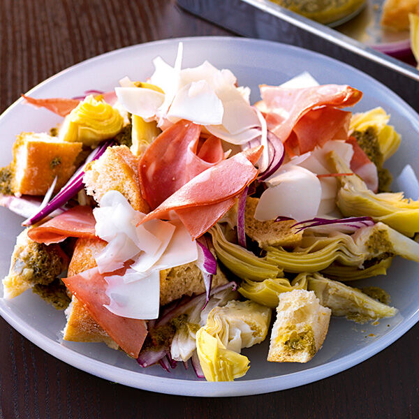 Kurz vor dem Verzehr den Ziegenkäse und die Mortadella zur Brot-Zwiebel-Artischocken-Mischung geben, das Dressing darübergießen und alles gut miteinander vermengen.