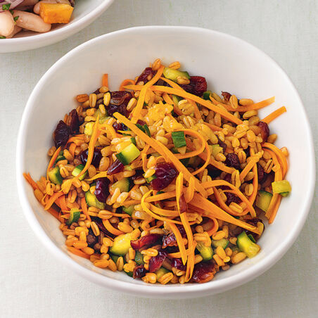 Inzwischen den Essig mit Salz, Pfeffer und dem übrigen Öl verrühren. Die Weizenmischung, Möhren und Gurken in dem Dressing wenden. Den Salat nochmals abschmecken und 15 Min. ziehen lassen, dann anrichten und servieren.