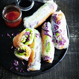 Tipp: Man kann die Sommerrollen gut vorbereiten, muss sie aber zur Aufbewahrung mit Backpapier oder Frischhaltefolie trennen, damit sie nicht aneinander kleben.