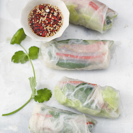 Ein Backblech mit einem feuchten Tuch auslegen. Das Reispa-pier nach Packungsangabe in kaltem Wasser einweichen und auf einem sauberen Küchentuch glatt ausbreiten. Auf jedes Reisblatt etwas Salat mittig auf das untere Drittel setzen, darauf 1 - 2 EL der Füllung verteilen. Das Reispapier an den Seiten über die Füllung schlagen und vorsichtig aufrollen. Die Röllchen nebeneinander auf das Backblech legen und mit einem feuchten Küchentuch bis zum Servieren abdecken.