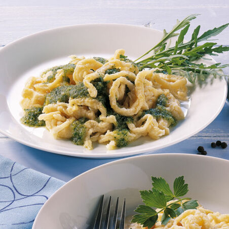 Dass man mit Spätzle mehr anfangen kann, als sie nur mit Käse zu bestreuen, sehen Sie an diesem Rezept. Versuchen Sie sie einmal mit Rucola-Pesto.