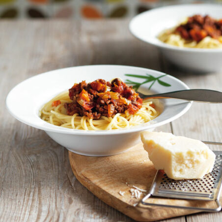 Die Sauce reicht für vier. Für zwei Personen in einem Topf 2 l Wasser aufkochen, 2 TL Salz hinzufügen und 200 g Spaghetti nach Packungsangabe in ca. 10 Min. bissfest kochen. In ein Sieb abgießen und in zwei tiefe Teller geben. Je ein Viertel der Sauce daraufgeben, die Hälfte des Parmesans darüberreiben. Die übrige Sauce zugedeckt im Kühlschrank aufbewahren (4-5 Tage) oder einfrieren (ca. 4 Monate).