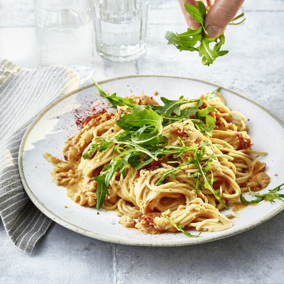 Tipp: Statt Rucola passen auch frische Sprossen zur Pasta.