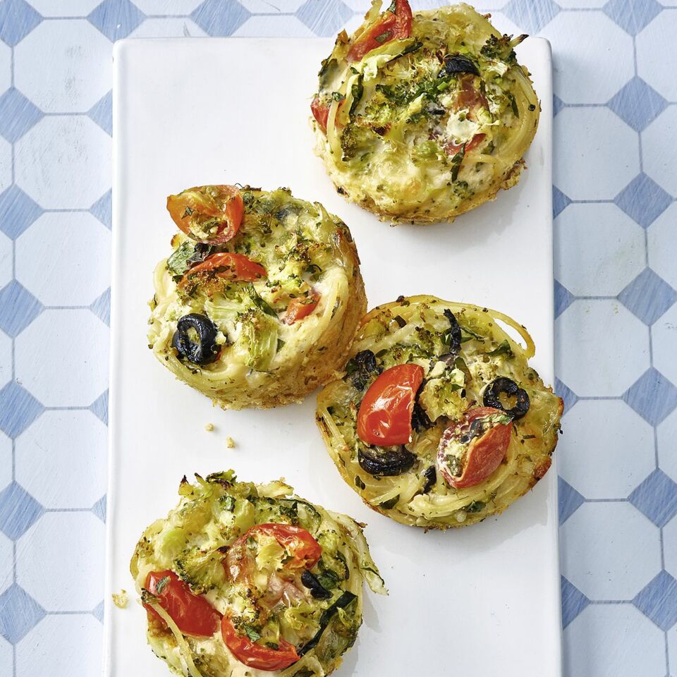Die Mischung mit der Küchenzange in die Muffinmulden füllen, dabei die Spaghetti leicht eindrehen. Das Gemüse und die übrige Flüssigkeit darüber verteilen. Die Muffins im Backofen (Mitte) in ca. 35 Min. goldbraun backen. 10 Min. ruhen lassen und herausheben.