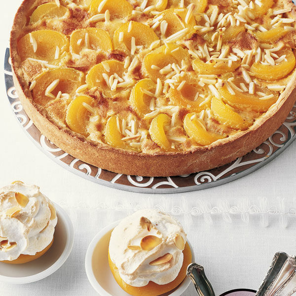 Die Aprikosenhälften auf Küchenpapier abtrocknen und von außen nach innen auf der tarta anordnen. Die Mandelstifte über die Aprikosen streuen. Die Aprikosentarte zurück in den heißen Backofen (Mitte, Umluft 160°) stellen und in etwa 15 Min. fertig backen. Am besten schmeckt sie lauwarm als Dessert.