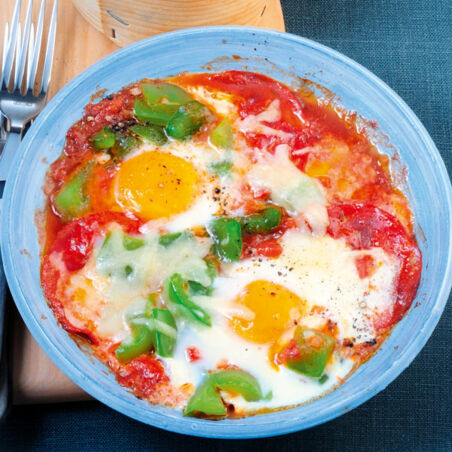 Wer es morgens schon deftig mag, der genießt bereits zum Brunch die Eier aus dem Ofen a la famenca mit Tomaten, Paprika und feuriger Chorizo.