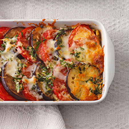 Den Backofen auf 200° (Umluft 180°) vorheizen. Auberginen trocken tupfen. Übriges Öl in einer Grillpfanne erhitzen, Auberginen darin bei starker Hitze portionsweise auf jeder Seite 1-2 Min. scharf anbraten. Herausnehmen, salzen und pfeffern. Eine große Gratinform mit Öl einfetten. Auberginen und Tomaten überlappend einschichten, bis alle Zutaten aufgebraucht sind. Zwiebelmix und etwas Käse daraufgeben. Die Eier seitlich zugießen. Mit Käse bestreuen. Im Ofen (Mitte) 25 Min. überbacken.