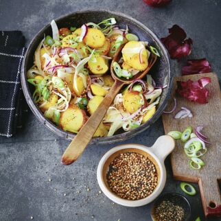 Reiche zu diesem lauwarmen Gemüsesalat Getreidebratlinge und schon hast du ein komplettes Essen.