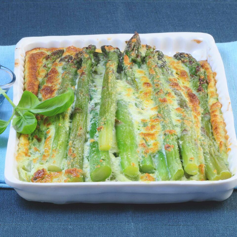 Den Spargel in die Form legen und die Mascarponemasse darauf verteilen. Im heißen Ofen (Mitte, Umluft 180°) in ca. 15 Min. goldbraun backen.