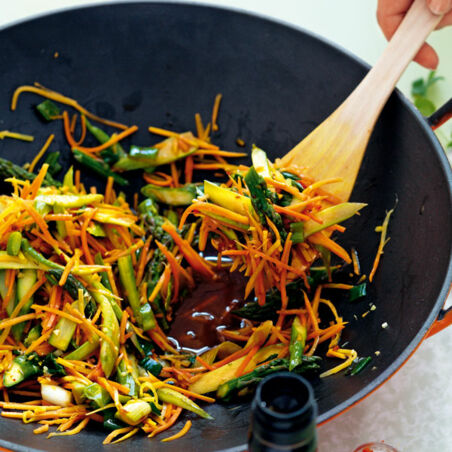 Das Öl in einer beschichteten Pfanne oder im Wok erhitzen. Spargel und Möhren darin bei mittlerer Hitze unter Rühren etwa 4 Min. braten. Zwiebeln, Ingwer und Knoblauch dazugeben, 1 Min. weiterbraten.
