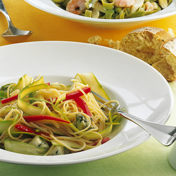 Für dieses Pastagericht wird der Spargel in hauchdünne Längsstreifen geschnitten und mit Paprikastreifen in Öl angebraten.